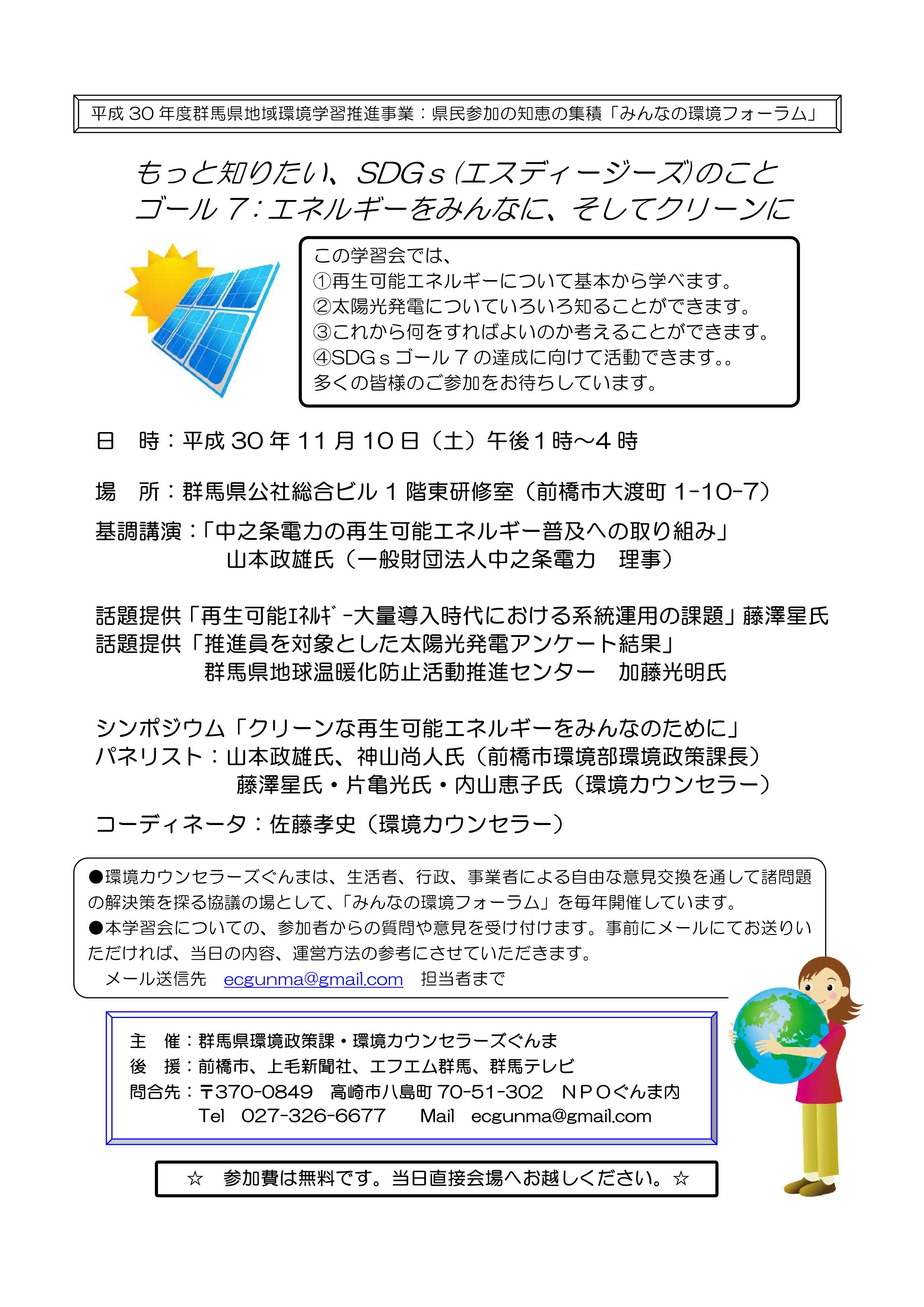 第2回環境学習会「もっと知りたい、SDGs(エスディージーズ)のこと ゴール7:エネルギーをみんなのために、そしてクリーンに 環境カウンセラースぐんま